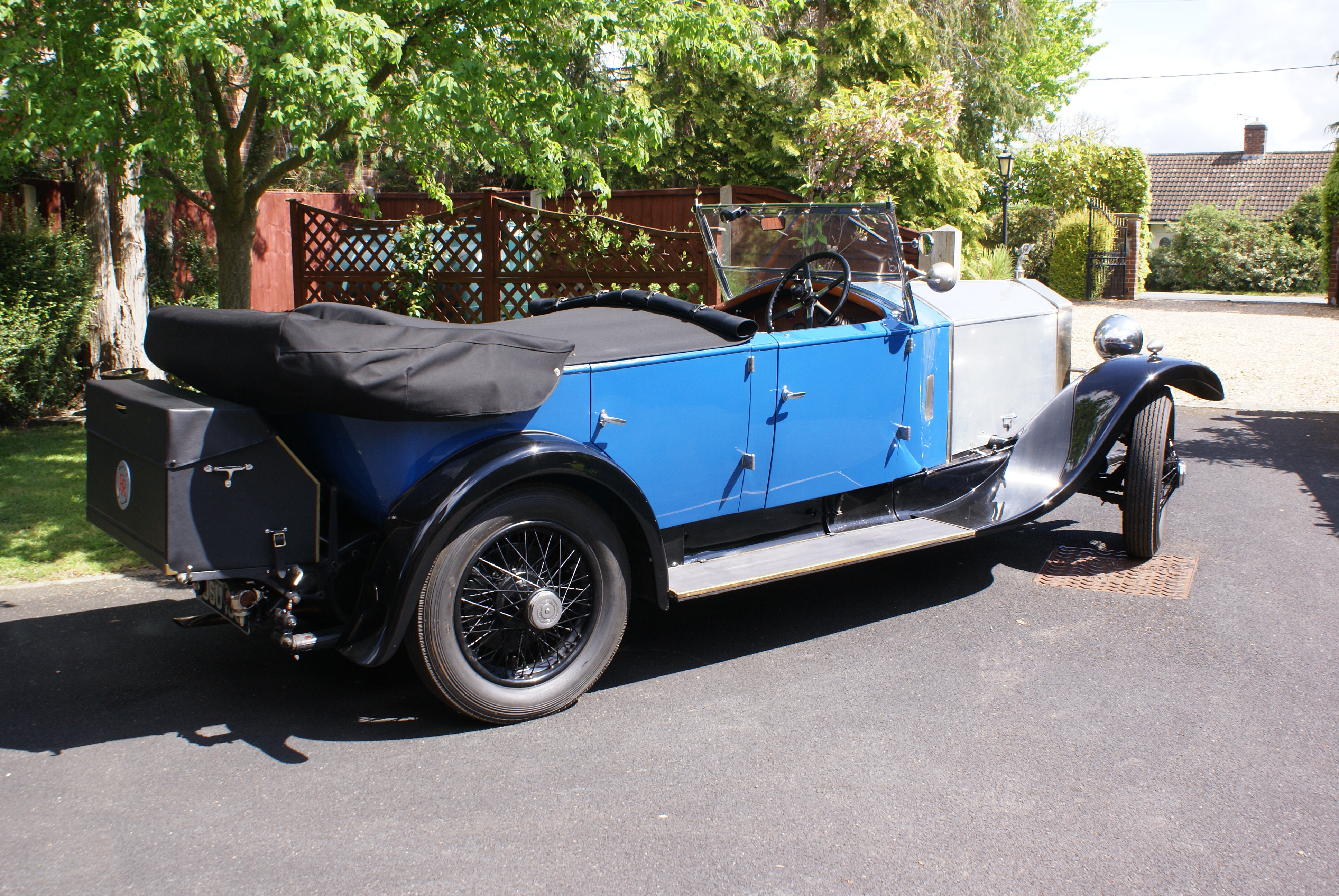 GXO87 has blue leather upholstery, folding picnic table, removable side screens and Barker Patent dipping headlights. It also has a removable touring trunk and tools. It is believed that the original registration number was CV 1504 a Truro number but on re-import it was allocated JSU199.
