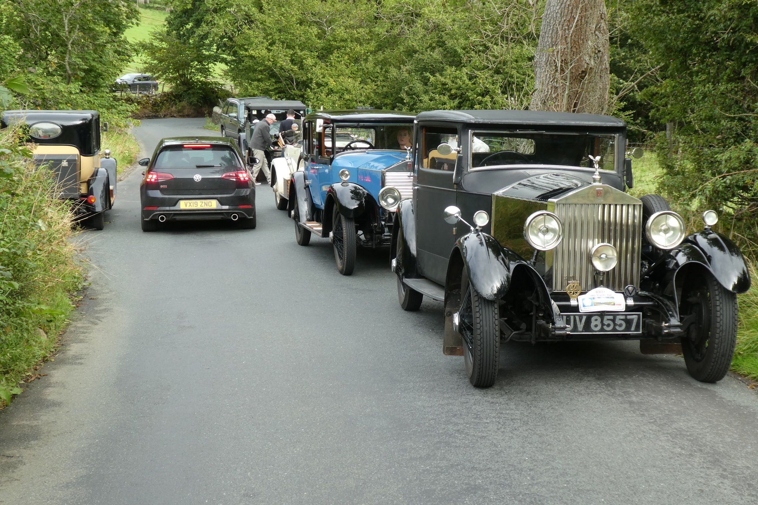 The cars lined up on the village green at Reeth